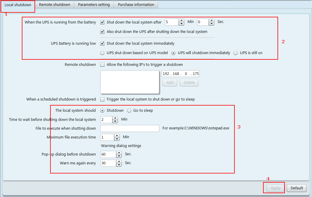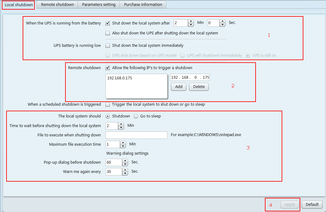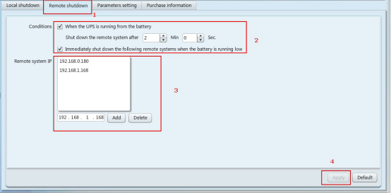 5. 交流電源關(guān)閉后,關(guān)機命令從192.168.0.175發(fā)送到192.168.0.180和192.168.1.168,然后自動關(guān)機,最后UPS關(guān)機。