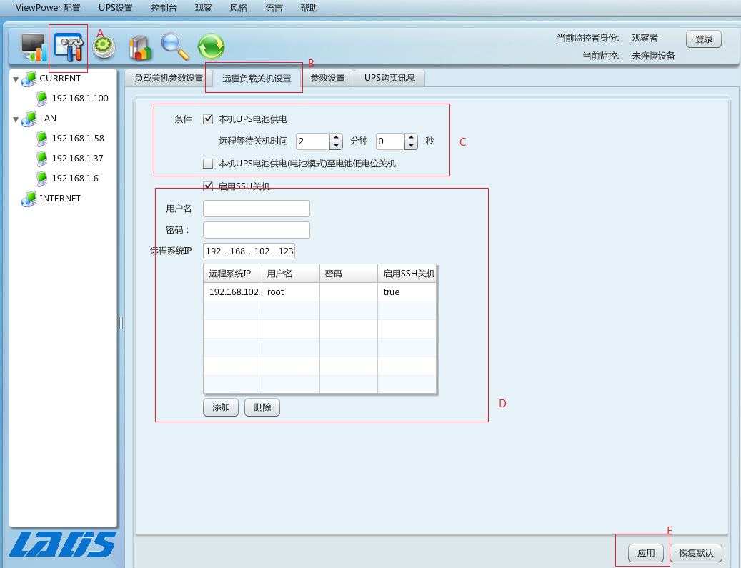 2、如果要在交流故障時關(guān)閉ESXi,請轉(zhuǎn)到UPS設(shè)置 》遠(yuǎn)程關(guān)機(jī)頁面,請參考A和B部分。然后選擇關(guān)機(jī)條件,并設(shè)置關(guān)機(jī)時間,參考C部分,并將ESXi服務(wù)器IP地址添加到IP列表,參考D.的部分。最后單擊“應(yīng)用”按鈕保存配置。